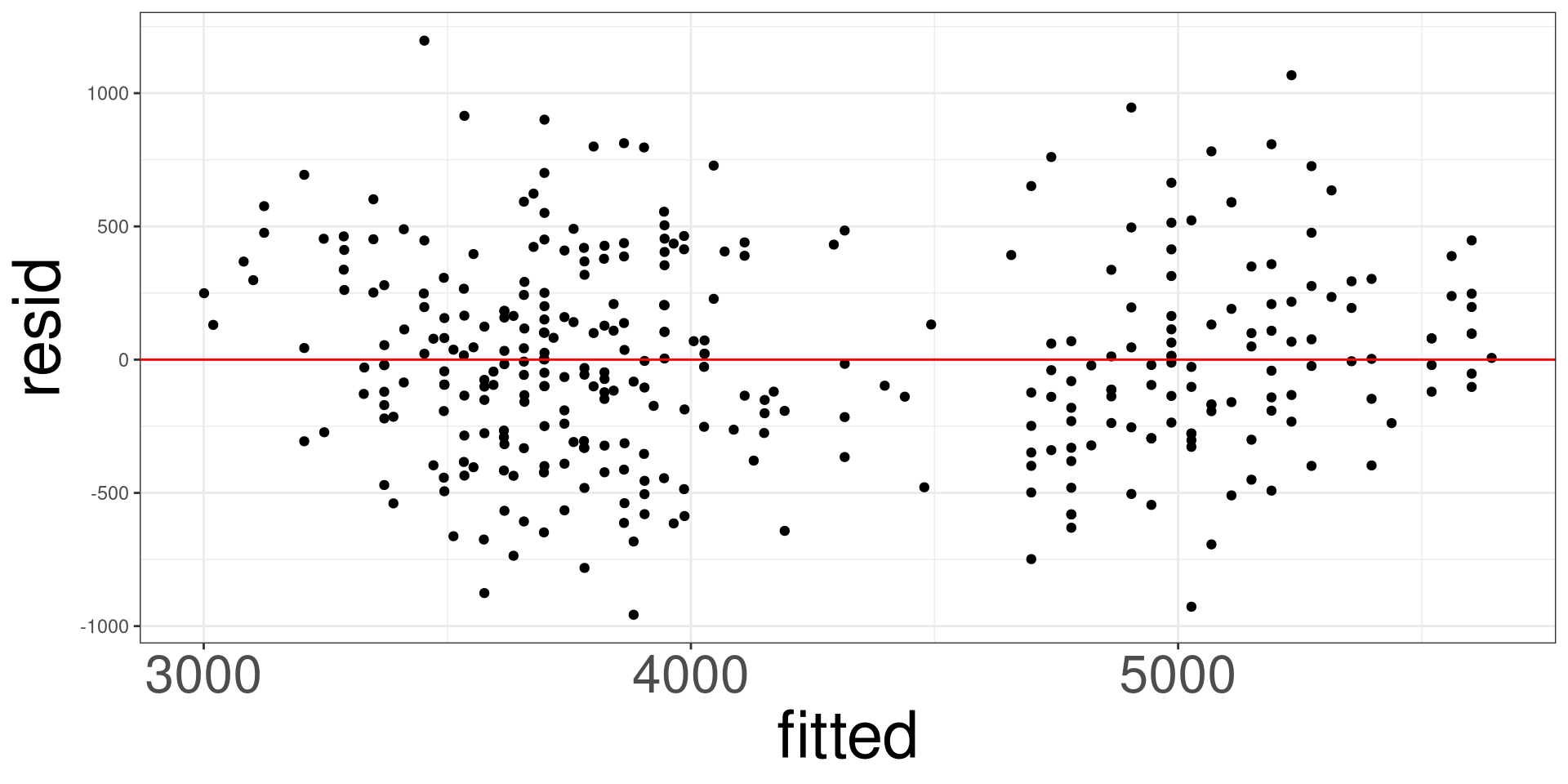 ggplot(RDF, aes(fitted, resid)) +geom_point() +geom_hline(yintercept =0, col ="red")