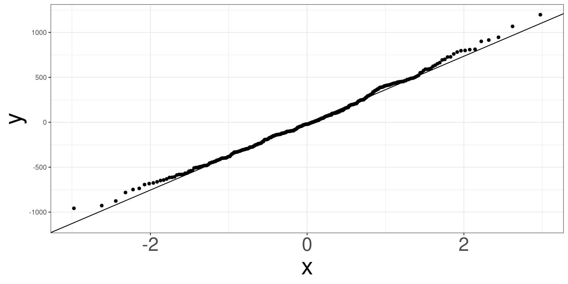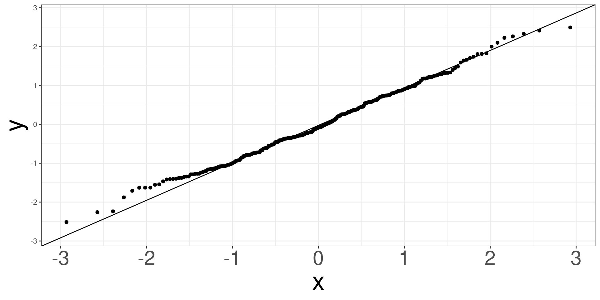 A qq (quantile-quantile) plot will plot the estimated quantiles of the residuals against the theoretical quantiles from a normal distribution function. If the points from the qq-plot lie on the \(y=x\) line, it is said that the residuals follow a normal distribution.