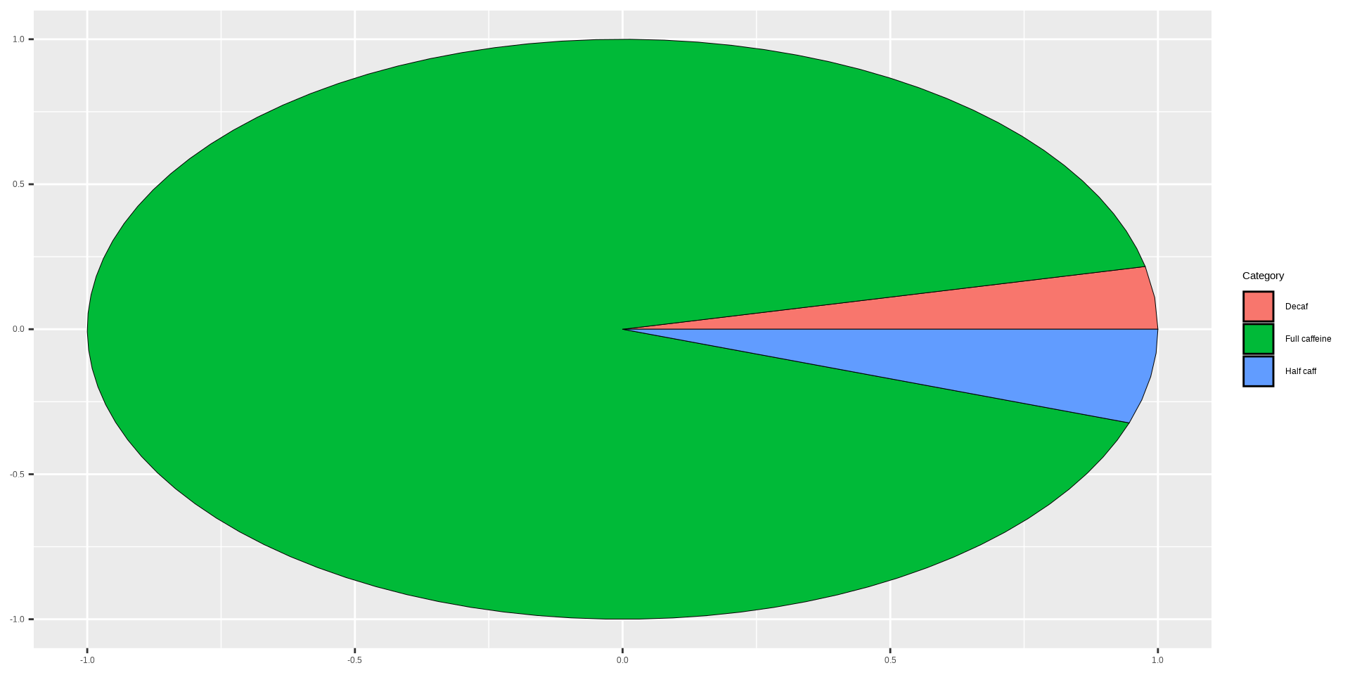coffee_pie <-cat_stats(coffee$caffeine, tbl_df =TRUE)$tableggplot(coffee_pie, aes(cat = Category, val = n, fill = Category)) +geom_pie()