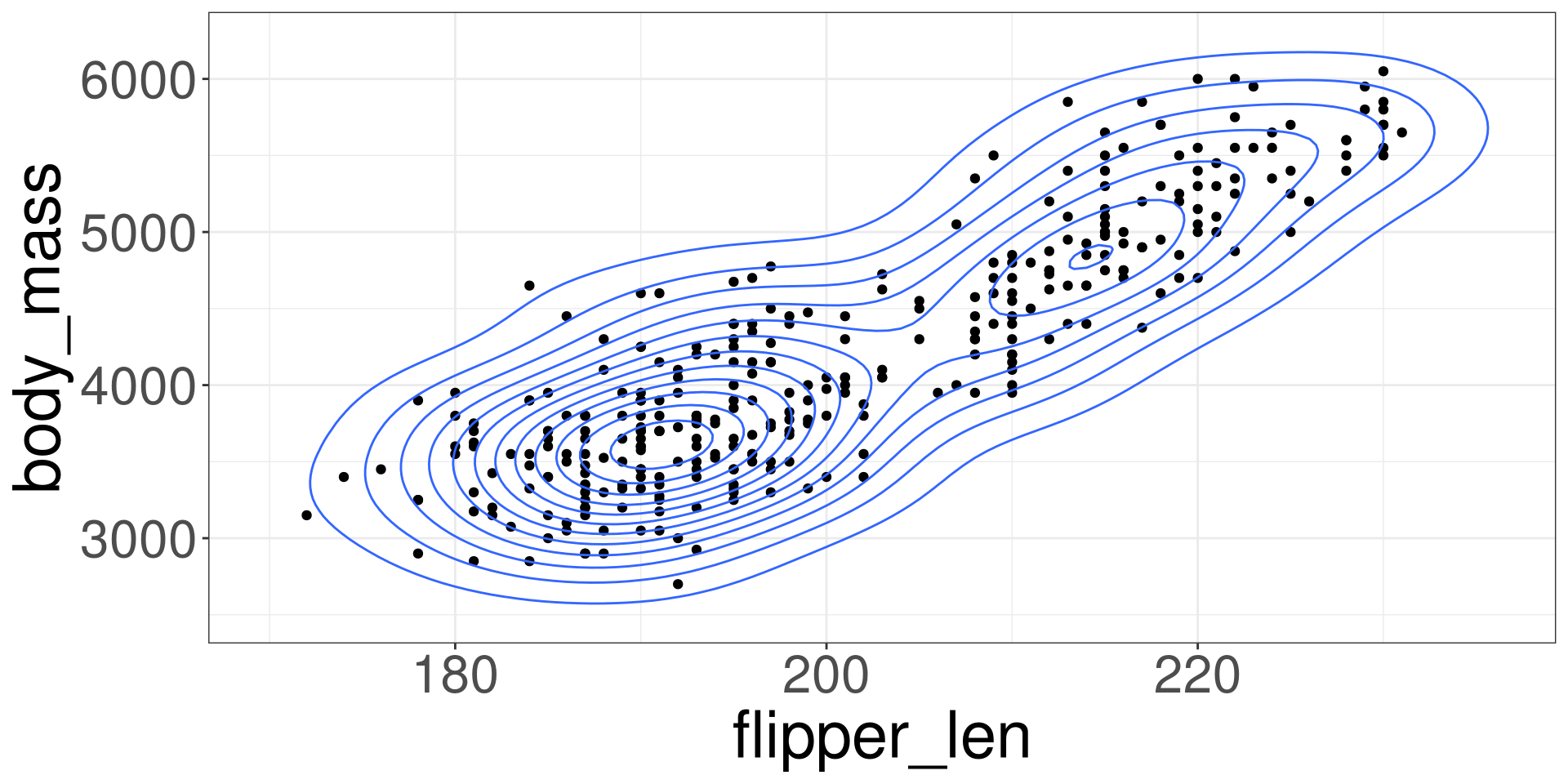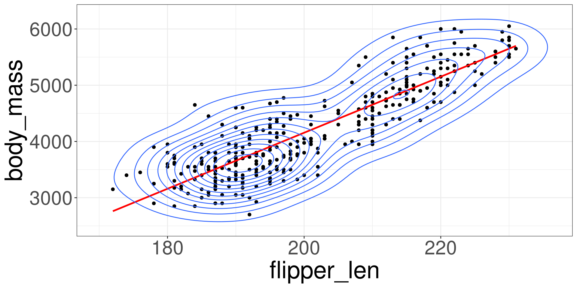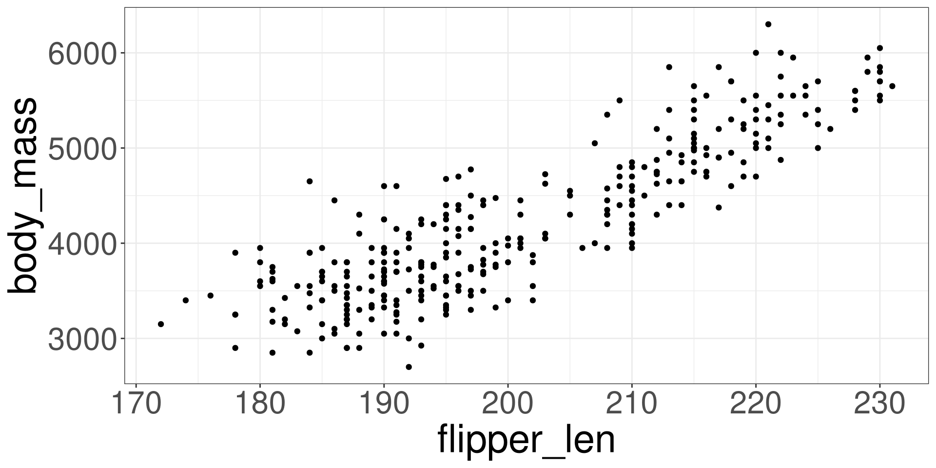 Making the variable body_mass be represented by \(Y\) and flipper_len as \(X\):