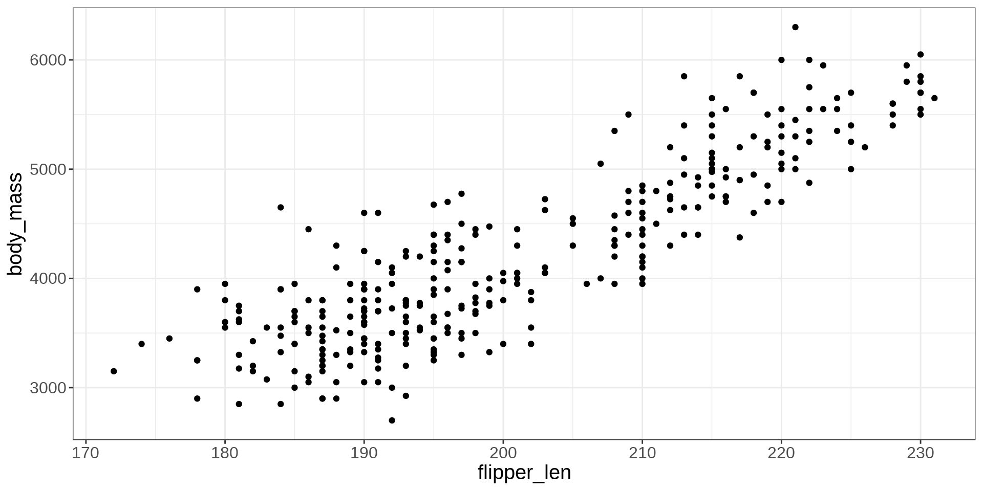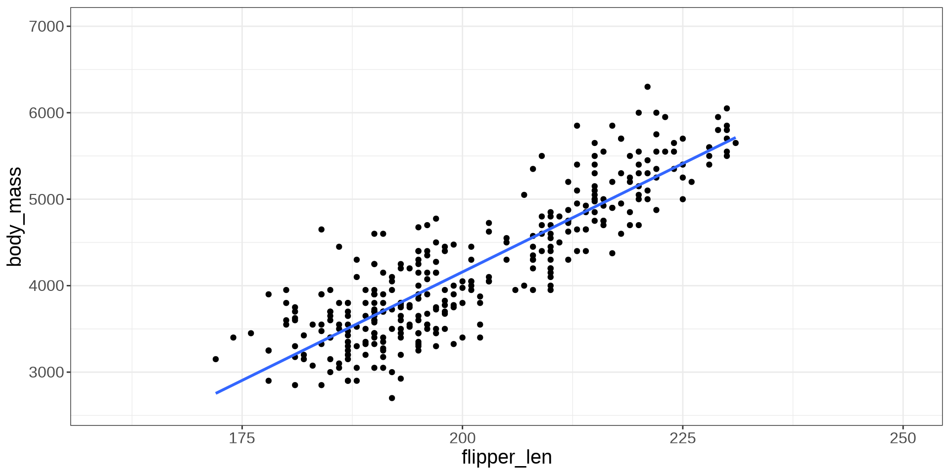 X: Name Predictor Variable of Interest in data frame DATAY: Name Outcome Variable of Interest in data frame DATADATA: Name of the data frameY: “body_mass”; X: “flipper_len”