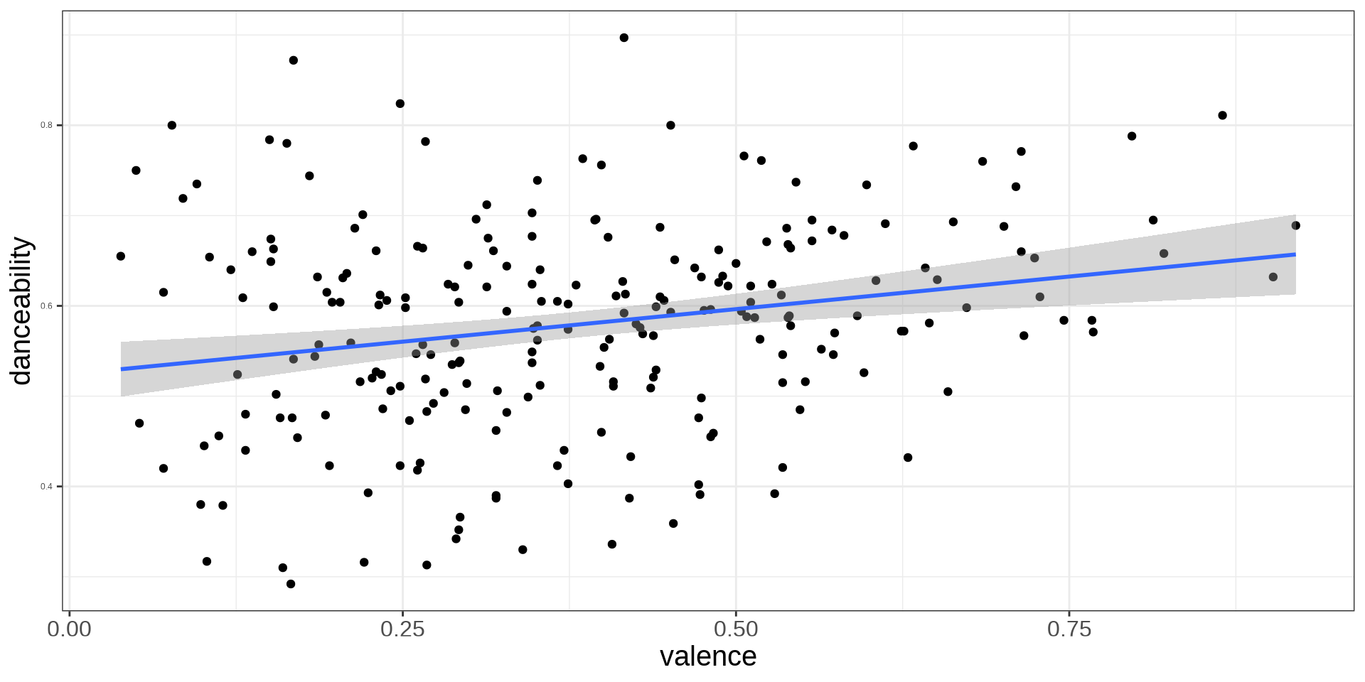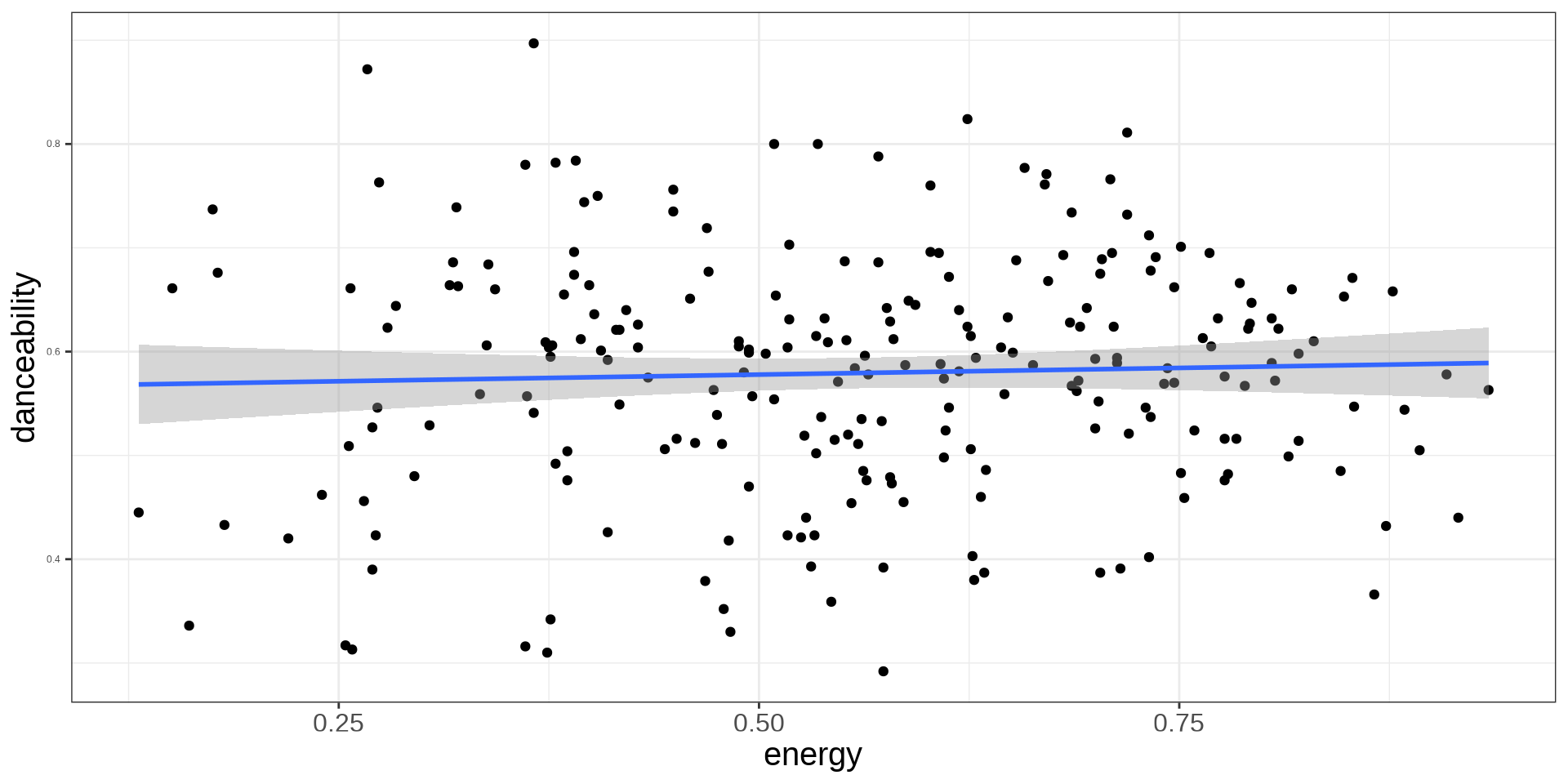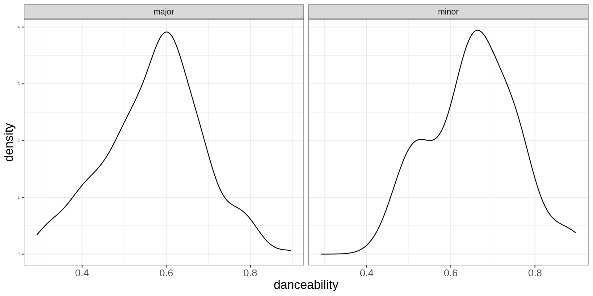 \[ dance = 0.54 + 0.07 Minor + 0.18 valence - 0.06 energy \] Minor song’s average danceability score is 0.07 units higher compared to Major song’s, adjusting for valence and energy.