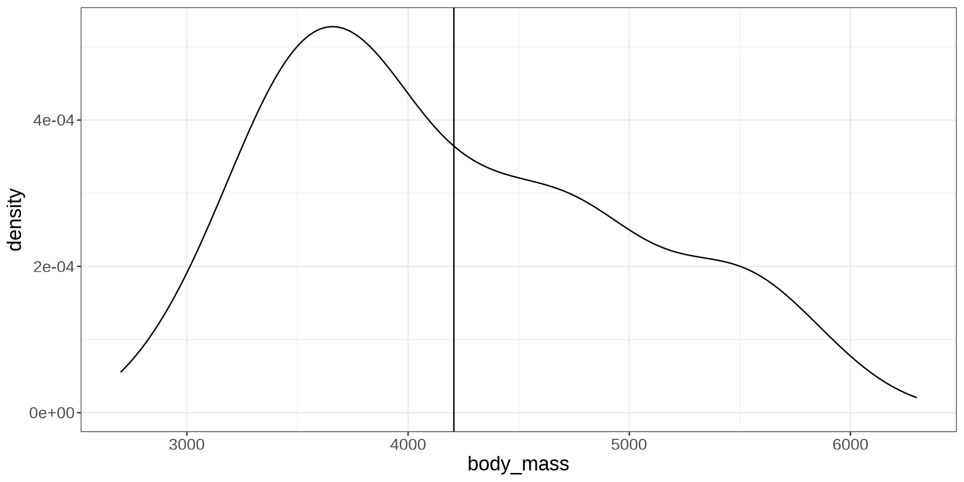 X: Name Predictor Variable of Interest in data frame DATAY: Name Outcome Variable of Interest in data frame DATADATA: Name of the data frameVAL: Value for the Predictor VariablePredict the body mass for a gentoo penguin.