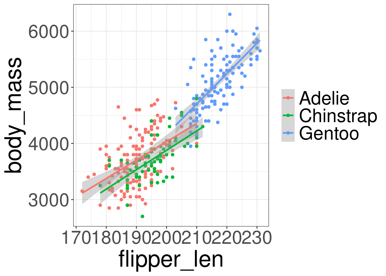 \[ body\_mass = \beta_0 + \boldsymbol \beta_1 (species) + \beta_2 (flipper\_len) \]