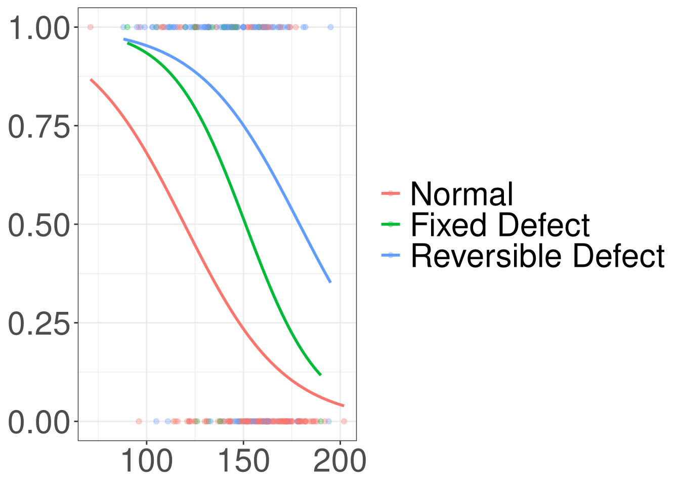 \[ lo(disease) = 2.255 + 0.305 (Fixed) + 0.46 (Reversible)\\ - 0.006 (thalach) \]