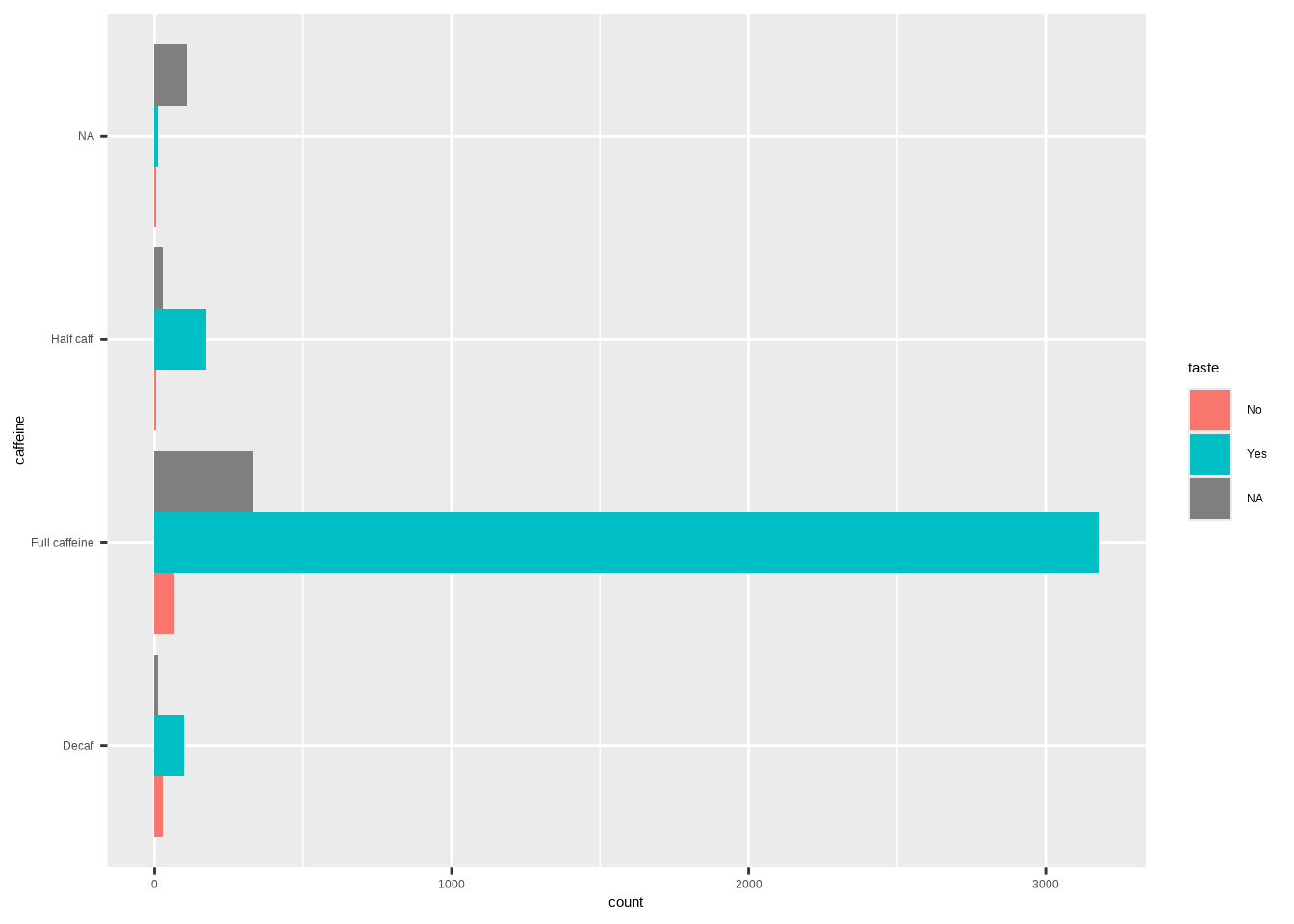ggplot(DATA, aes(x = VAR1, fill = VAR2)) + geom_bar()DATA→ the name of your dataset (e.g.,coffee).VAR1→ a single categorical variable (e.g.,caffeine).VAR2→ a single categorical variable (e.g.,taste).